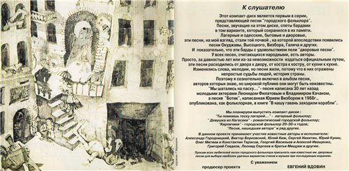 ![]() ![]() ![]() ![]() ![]() Уточненный плейлист: 1. Владимир Качан - Мы шатались на Пасху...(ст. Л.Филатова, муз. В.Качана) (5:11) 2. Игорь Луньков и Анатолий Колмыков - Шатья беспризорная (2:22) 3. Сергей Никитин - Машина АМО (3:11) 4. Сергей Никитин - Песня об Одессе-маме (3:07) 5. Виктор Луферов - Жил на свете Хаим... (1:44) 6. Виктор Луферов - Вернулся-таки я в Одессу... (3:31) 7. Виктор Берковский и Дмитрий Богданов - Ботик (ст. и муз. Ю.Визбора) (2:14) 8. Леонид Сергеев - Духовная пьяницы (2:32) 9. Светлана и Ольга Волошины - Крошка-Кисанька (2:59) 10. Владимир Туриянский - Котенок Барсик (1:28) 11. Наталья Дудкина - На всех мужчин мне глубоко плевать... (1:49) 12. Сергей Никитин - Губ твоих накрашенных малина... (2:30) 13. Сергей Никитин - Задумал я, братишечки, жениться... (1:45) 14. Виктор Берковский и Дмитрий Богданов - Портянка (1:57) 15. Сергей Никитин - Дженни и Джонни (1:52) 16. Александр Мирзаян - Ванинский порт (2:24) 17. Владимир Туриянский - Девушка в синем берете (1:50) 18. Сергей Никитин - Вот идет за вагоном вагон... (3:33) 19. Наталья Дудкина - Черный ворон (2:26) 20. Вадим и Валерий Мищуки - Девушка с острова Пасхи (2:11) 21. Юлий Ким - Из Мадрида в Лиссабон... (1:56) 22. Игорь Луньков и Анатолий Колмыков - В Кейптаунском порту (2:58) Файлообменник - Cканы обложек - отдельным архивом 3,1 mb